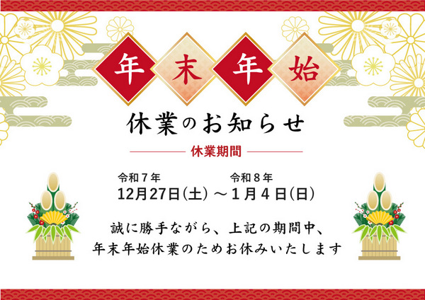当社では、誠に勝手ながら 12月27日(土)~1月4日(日)の期間を年末年始休業とさせていただきます。 休業期間中にいただいたお問い合わせにつきましては、1月5日(月)(通常営業)より順次対応させて頂きます。お客様にはご不便をおかけいたしますが、何卒ご理解賜りますようお願い申し上げます。